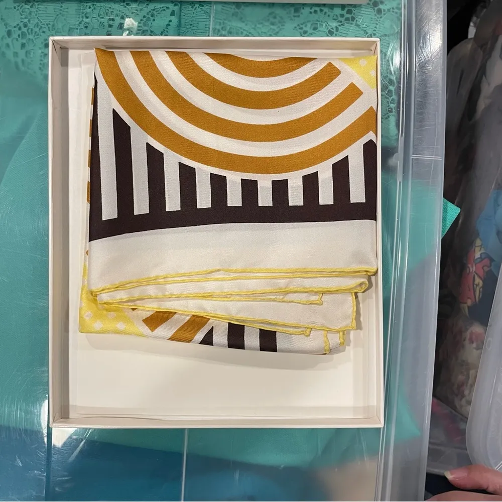 Vintage 60’s-70’s Lanvin Paris silk luxury geometric scarf in original box luxury. Very cool find! Scarf measures approximately: 26.5” x 26.5”. Box measures approximately: 8.75” x 9.75” x .5”. Scarf has a very very tiny imperfections and a small stain in 1 corner. Tried to show all flaws in photos. Box has some very light scratches as to be expected. Foulards which is smaller and lighter than a scarf and worn in the spring or fall.