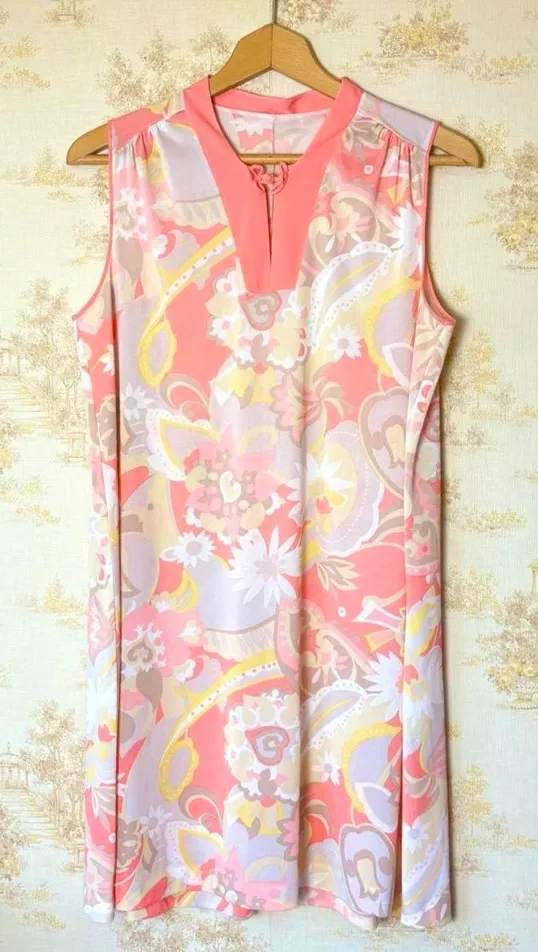 Vintage 60s 70s pink white floral paisley mod print satin sleeveless mini dress Size XL - $32 - From Mallory