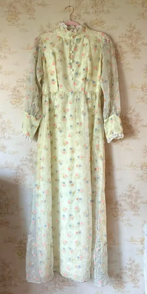 Vintage 60s 70s yellow floral embroidered maxi long sleeve cottagecore prairie dress No size tag -... Show more