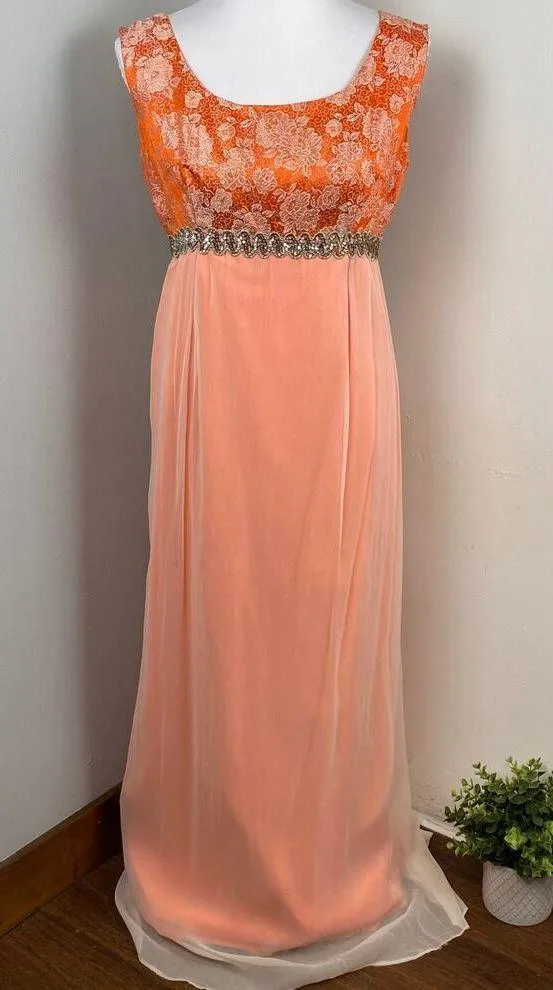 Vintage 60s Maxi Gown Orange Floral Tapestry Bodice with White Chiffon Overlay Silver Sequin Embellished Empire Waist Sleeveless Back Zipper Handmade No Tags Best guess is a medium based on measurements, laying flat Chest 19” Waist 16” Length 56” There is some very faint marks on skirting, very hard to notice, pictured. Otherwise in excellent condition. Formal Prom Dance Cocktail Professional Career Business Wedding Engagement Bridal Mother of the bride Guest Winter Ball Homecoming Retro Evening Gown Princess Peach Cosplay Elegant Classy Vintage Artisan Hand Crafted Shower Sock Hop Photo Shoot Photo Shoot Unique One of a Kind