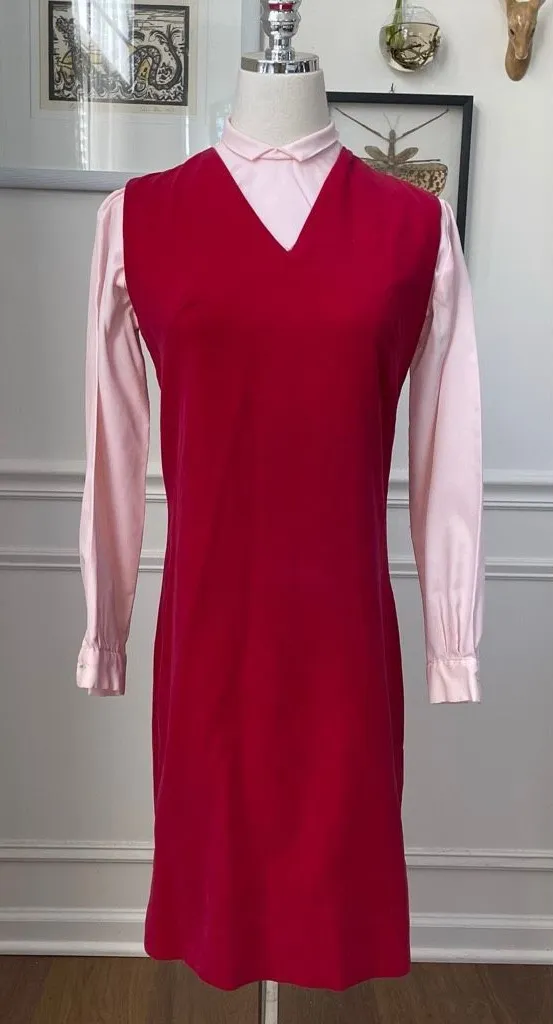 Very partridge family 60s two-piece set, including a V-neck sleeveless red velvet, teen jumper and a cropped long sleeve high neck blouse in pastel pink. Where together or mix and match. No brand and the only tag identifies as size 7, but it is featured on my size small dress form , and I think it is closer to an XS orS. Please check measurements. The blouse measures 12.25 inches shoulder to hem and 17.5 inches armpit to armpit. The jumper is V-neck and has a metal zipper. It is 35.5 inches long measuring inches armpit to armpit and 16 inches straight straight across the waist. 16.75 inches across the hip. There is a very faint, dark mark and a faint light mark on the front of the jumper. I didn’t even notice them until I was photographing. I have not stain treated. In my opinion could easily be worn with as is because it is not very noticeable. Threaded loops at the waist to add your own belt. None included. Or you could easily wear without. It looks like the cuffs on the blouse used cufflinks because there are two button holes, but no button. It does not come with either.