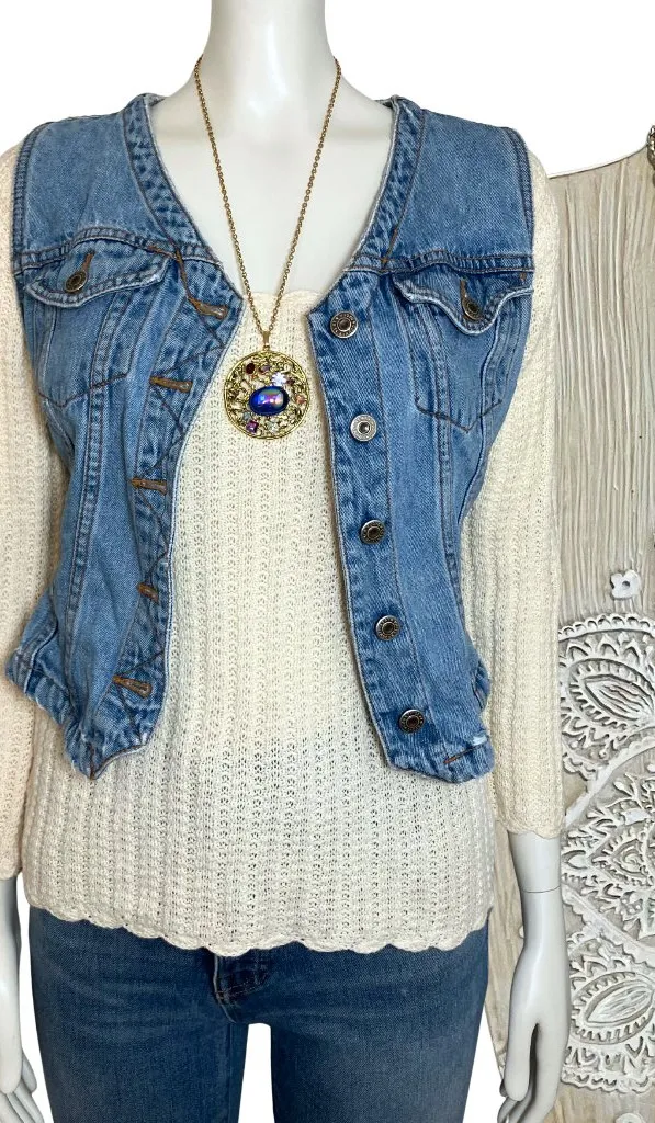 Gold tone iridescent art glass cabochon openwork medallion mid century necklace with other faceted accent gems on a 24” chain from the late 60s to early 70s.