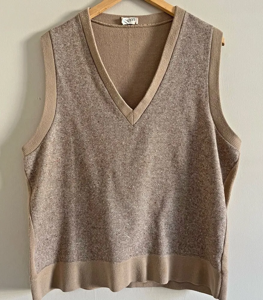 Cozy and nostalgic, this vintage late ’70s/early ’80s V-neck sweater vest features a warm taupe-brown flecked knit with ribbed trim at the hem, collar, and sleeves. A versatile layering piece that pairs effortlessly with collared shirts or turtlenecks—perfect for cooler seasons and retro-inspired style. • Era: Late 1970s to early 1980s • Color: Taupe/brown with multicolor flecks • Size: No tag — best fits a modern Large to XL depending on desired fit • Material: Feels like a wool blend (tag not present) • Care Tag: “Clean Only, Lightly Press” • Style: Deep V-neck, ribbed trim, boxy relaxed fit • Flat Measurements: • Pit to pit: 22” • Length (shoulder to hem): approx. 26” • Condition: • Tiny hole on bottom ribbed hem • Small faint spot on collar and one on bottom band • Light pilling throughout • Priced to reflect flaws Could fit as a unisex style! vintage 70s, grandpa core, retro layers, dark academia, fall fashion, quiet luxury, oversized fit, preppy vintage, earth tones, neutral aesthetic, wool vest, minimalist layering, soft grunge, retro prep, slouchy knit, vintage oversized, brown tones, classic academia