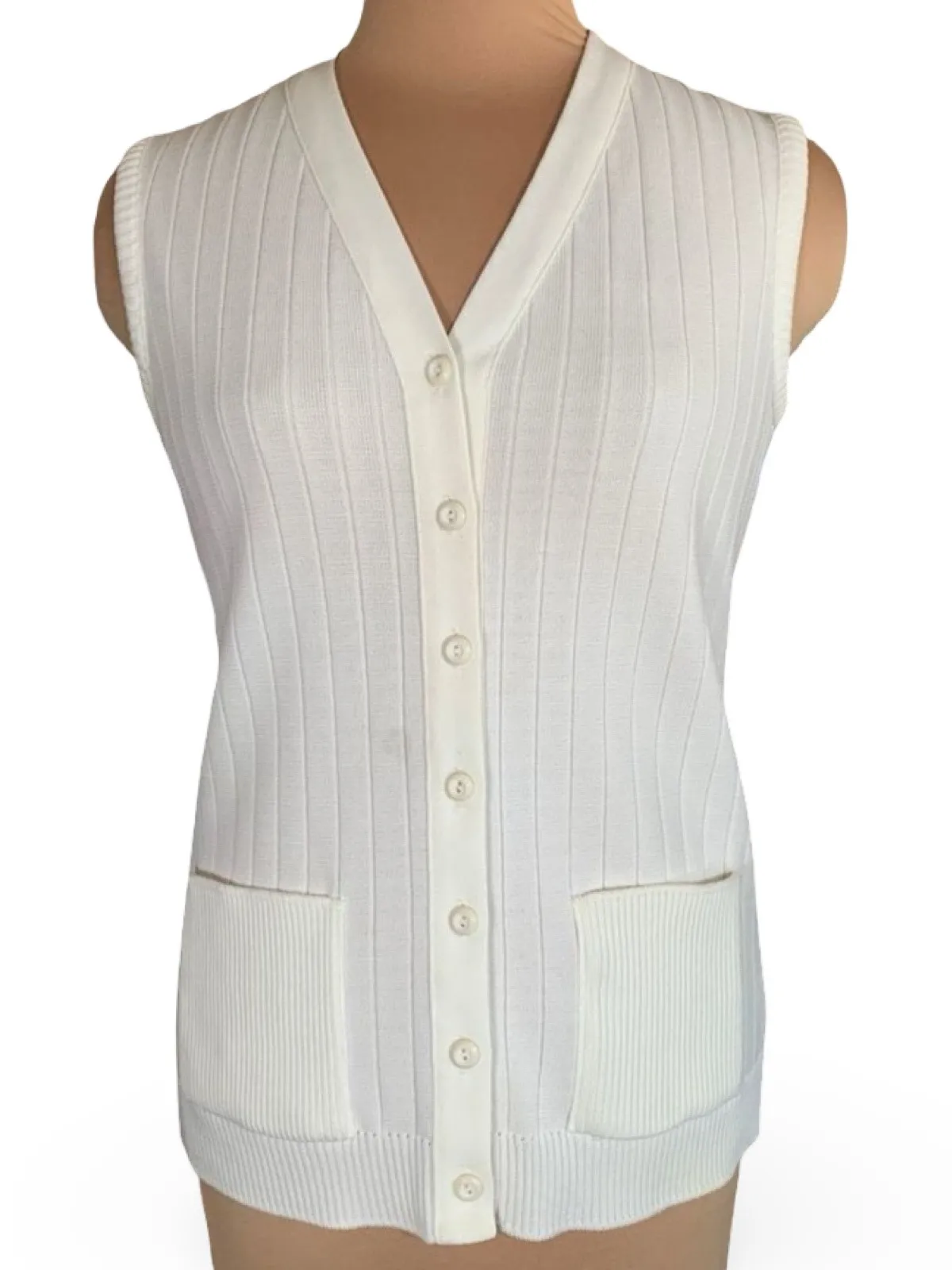 Dalton Vintage 70s white knit sweater vest Sleeveless V neck button front Vertical rib knit with front pockets Tagged Size 16 vintage fits modern Medium Large Lightweight Trevira polyester knit Flat Lay Measurements 18 inches pit to pit 25.5 inch length Perfect classic layering for fall teacher outfits workwear and everyday style