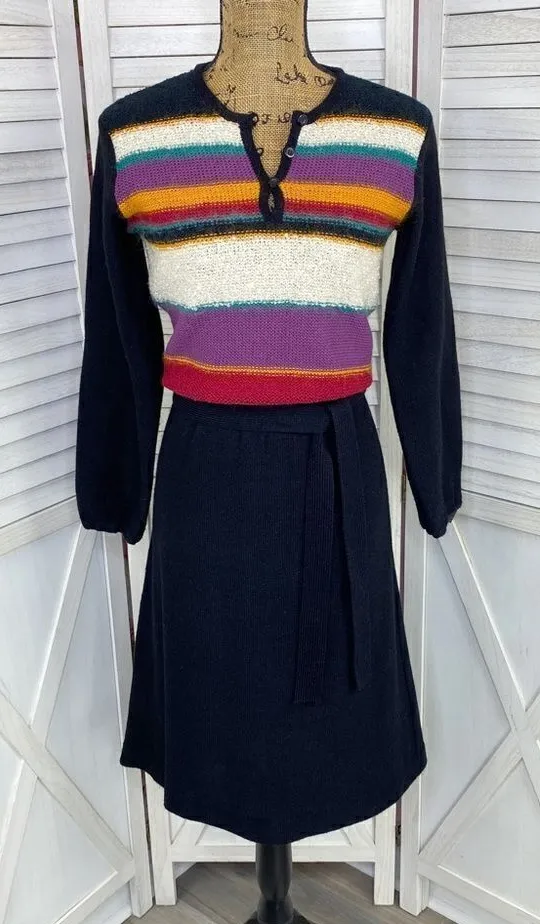 DeJaVu Vintage 70s Striped Fit & Flare Sweater Dress Size 9-10 Medium - see measurements in photos Striped upper Black skirt & sleeves Long sleeve with elastic cuffs giving a balloon look Button v-neck Acrylic mohair blend knit Matching tie belt Wear without belt to give a drop waist look A-line skirt Pullover Armpit to armpit 17” Waist 16” Length shoulder to hem 44” Retro Vintage Sweater dress Stripe 70s 80s Fit & flare Streetwear Knit Fuzzy Office dress Church dress Conservative Everyday Modest Dark #EE”