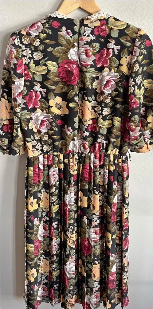 Romantic vintage prairie dress by Brelii, made in the USA and dating to the late 1970s–early 1980s. Features a rich dark floral print in warm autumn tones, a delicate lace Peter Pan collar, and a removable faux pearl necklace accent for an elevated vintage look. Long sleeves and a softly gathered waist create a flattering, flowy silhouette. Finished with a back zipper closure. A perfect cottagecore, prairie, or romantic vintage piece — ideal for fall layering, special occasions, or everyday vintage styling. Details: • Vintage Brelii dress • Size 8 (vintage sizing – see measurements) • Made in USA (ILGWU union tag) • 100% polyester • Long sleeves • Lace collar detail • Removable faux pearl necklace accent • Back zipper closure Condition: Very good vintage condition. Elastic at the waistband has relaxed over time, which is common with vintage garments; the waist no longer has strong stretch. Original belt is not included. Lace collar shows light, age-appropriate wear. No major flaws noted. Length 43” || pit-pit lying flat across 19-20” || waist lying flat across 15” This item is shipped simply and sustainably — no excess wrapping, just mindful packaging in a clean poly mailer. Keywords: vintage prairie dress, cottagecore dress, 70s floral dress, lace collar dress, romantic vintage, dark floral, fall prairie dress, made in usa vintage