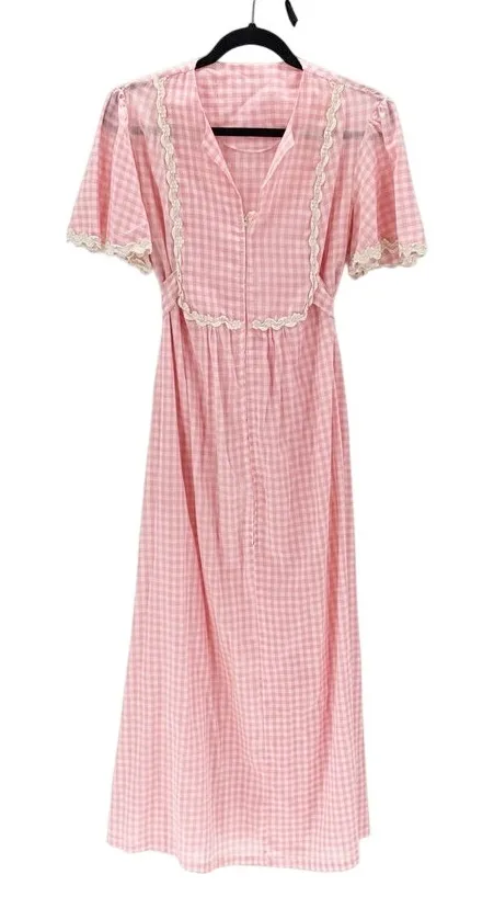 Vintage 70’s Gingham Daisy Lace trim flutter sleeves maxi dress tie back prairie Pink Size L - $38 - From Krystal
