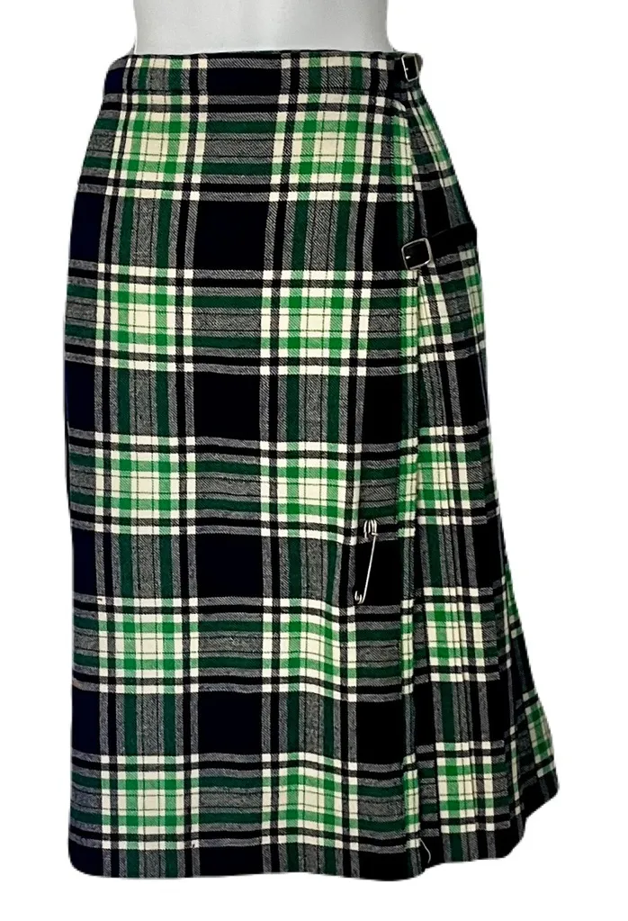 Vintage 70s Glenisla Classics 100% Scottish wool green and blue plaid tartan kilt skirt. Adjustable velcro and buckle closure with large safety / kilt pin. Wear throughout, hole near pin and staining at front - see photos. Waist: 12.5-14.5” (laid flat) Length: 27.5” Size 6