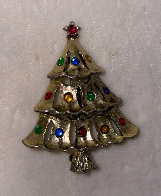 Vintage 70’s Gold Tone and Jeweled Christmas Tree Brooch - $10 - From Kate