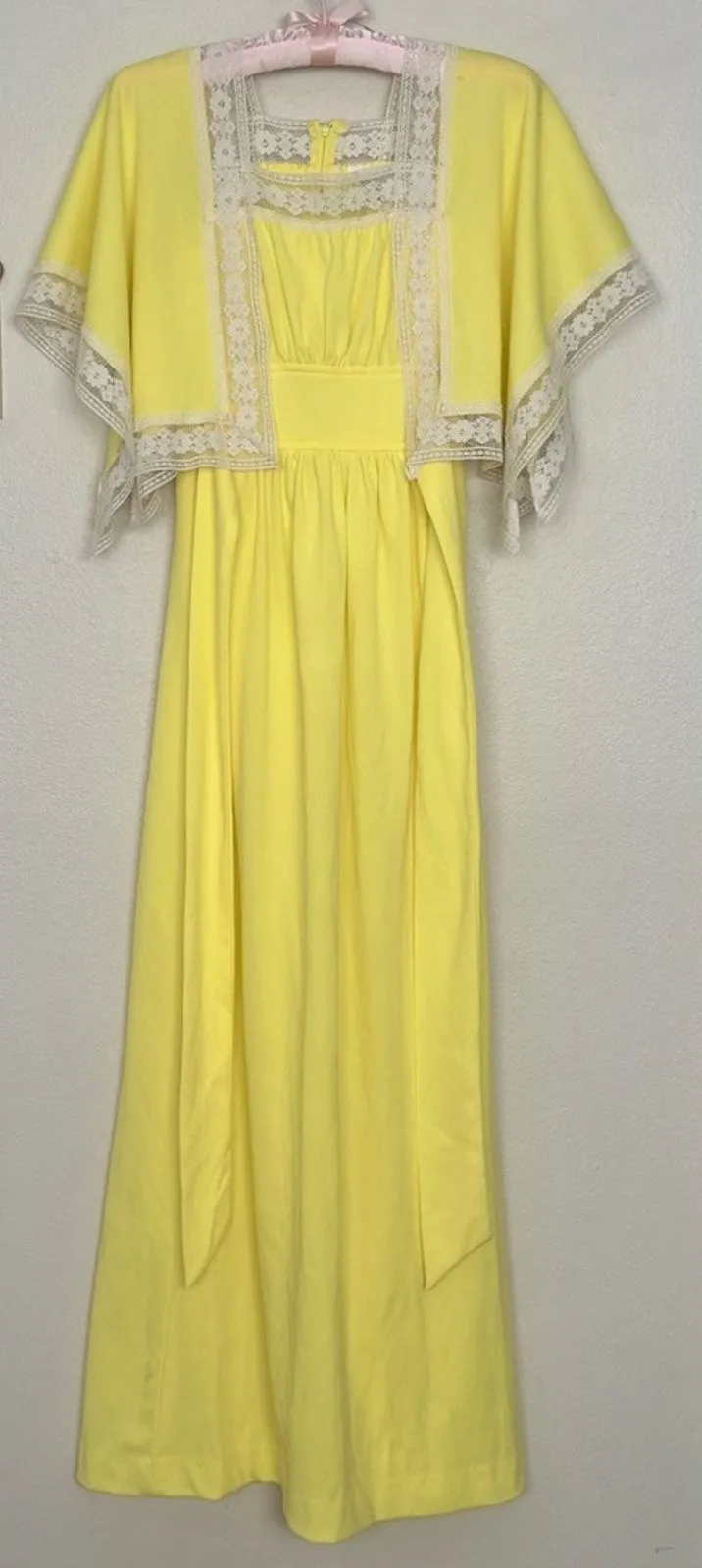 Elegant yellow maxi dress. Features lace trim detail. Perfect for summer occasions. fair/good preowned condition - true vintage - no major flaws, but there are lots of small spots and imperfections see the photos and there is a smell. This is a very old item. I would recommend getting it dry cleaned or allowing it to air out in the sun. I did wash it by hand and it’s a lot better but there’s still a faint smell I think. Perfect for Boho, hippie, hippy, retro, vintage, maximalist, coastal cowgirl, western, southwestern, equestrian styles