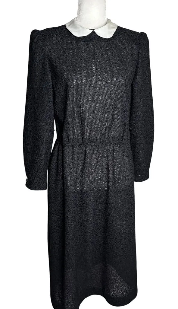 • Long sleeves with slight puff detail • Lightweight, breathable fabric • White Peter Pan collar • Elastic waistband for flexibility • Made in the USA, union label No visible flaws Slightly sheer Vintage size 14, fits like a Medium Chest: 19" lying flat Sleeves: 22" Length: 43" shoulder to hem Waist: 16" lying flat, unstretched