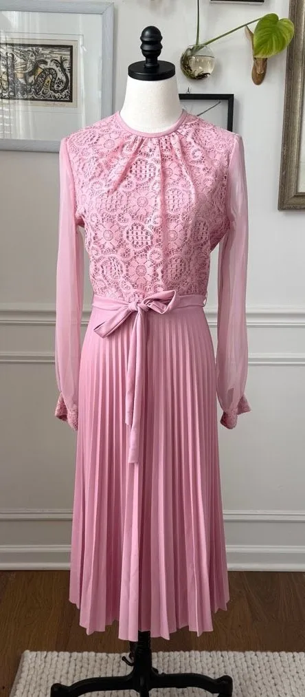 70s Mister Jay pink two piece outfit, including dress and sleeveless open front lace vest. No size tag but featured on my size medium dress form gor scale. The dress is lined lace up top with long billowy sheer sleeves and gathered lace cuffs. There is a removable coordinating sash that ties at the waist before falling to a pleated a line skirt. Laying flat the dress measures 44 inches shoulder to hand, 14 inches straight across the waist and 18 inches armpit to armpit. The lace vest has a notched lapel and pointy collar. It is sheer and unlined. Laying flat it measures 23 inches shoulder to him and 17.5 inches armpit to armpit with open seam touching. Talon back zipper. No noted laws. Would probably fit a modern size small or medium best. Please double check measurements to ensure the proper fit for you.
