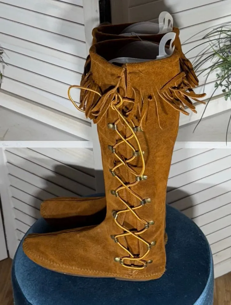 Step back in time with these Vintage 70s Moccasin suede leather brown boots. Designed for the modern trendsetter, these knee-high lace-up boots blend comfort and style effortlessly. The rich brown suede provides a luxurious look while ensuring durability for everyday wear. The fringes add a playful touch that enhances your unique style, making them perfect for festivals or casual outings. Don’t miss out on this timeless piece that will elevate your wardrobe and turn heads wherever you go. Grab yours today and embrace the retro vibe! **Key Features ** - Lace-up design - Knee-high length - Stylish fringe detail - Thick genuine suede leather great quality! - Lace tie on sides - Made in USA -Minnetonka style boots Condition: Excellent used condition - check pictures for measurements #VintageStyle #SuedeBoots #70sFashion #FringeBoots #RetroChic