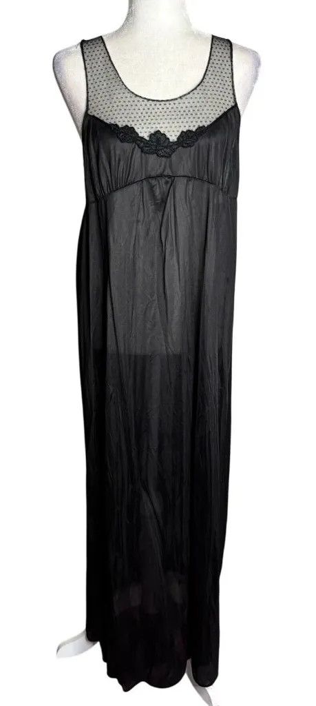 • 100% Nylon With Sheer Polka Dot Mesh Details • Floral Lace Trim On Bodice • Empire Waist For A Flowing Fit • Sleeveless Full-Length Gown • Union Made Excellent condition No visible flaws Chest: 16.5" lying flat Length: 52" shoulder to hem 100% Nylon Made in USA