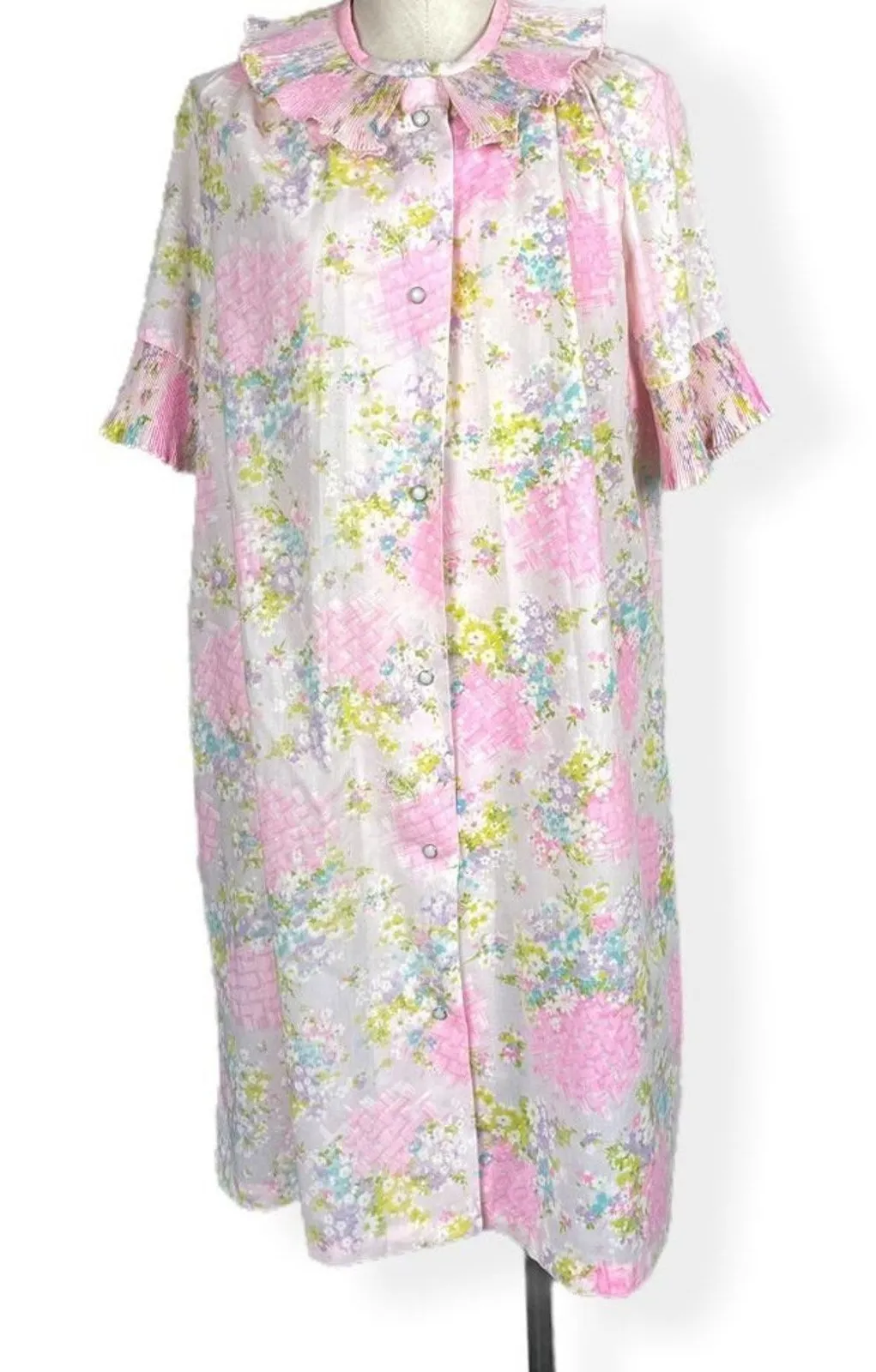 Vintage 70s Light Floral Print House Coat with Peter Pan Caller, Short Sleeve Snap Front, One Hip Pocket on The Front, Brand Tag is coming unattached and is missing top snap otherwise in good condition, Tagged as a size 14 could fit up to a size 18 Measurements (approximate): Laying Flat Not Doubled Pit To Pit: 23 1/2” Waist: 26 1/2” Length: 40”