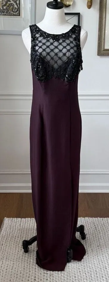Vintage 80s or early 90s flirtations by Alfred Angelo formal column gown. The bodice is black mesh a... Show more