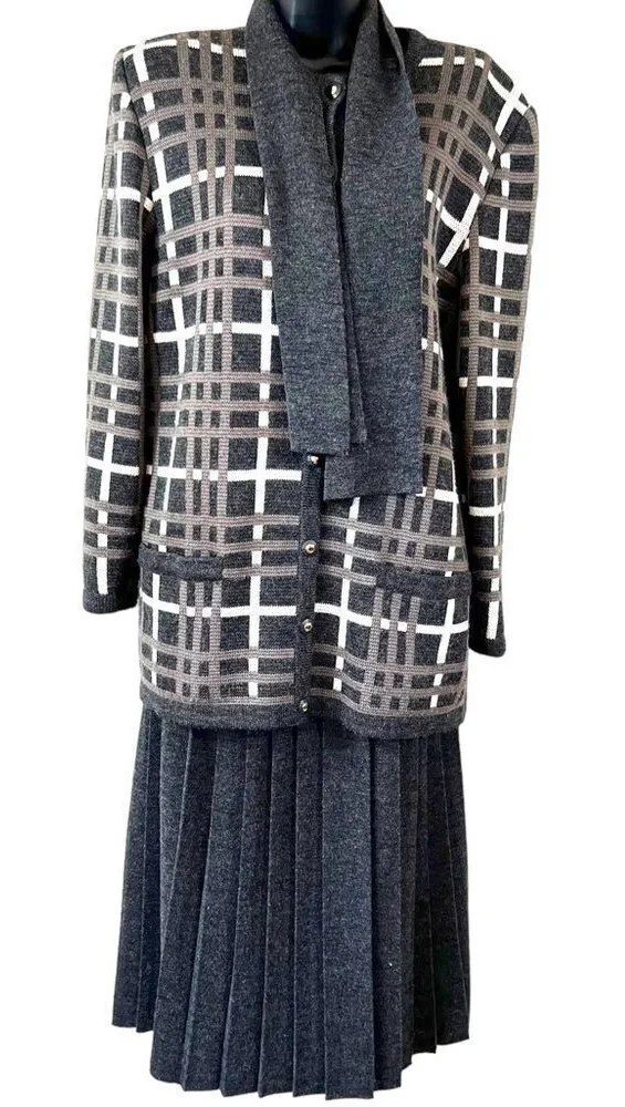 Vintage 80’s Bellino Paris knitted wool blend cardigan & pleated skirt set Very good vintage 80’s condition Flaw: cardigan is missing a button as shown in photos. Shoulder pads Neck scarf Button down Plaid style wool blend in gray and tan Matching pleated skirt with elasticized waistband Skirt is lined Size 12 See photos for approximate measurements