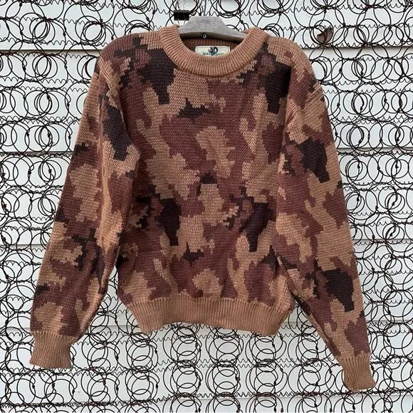100% acrylic made in Korea No size tag, fits a modern medium comfortably Please note pilling and thread pulls flat measurements are approximate pit to pit 24 inches shoulder to hem 24 inches shoulder seam to wrist 25 inches