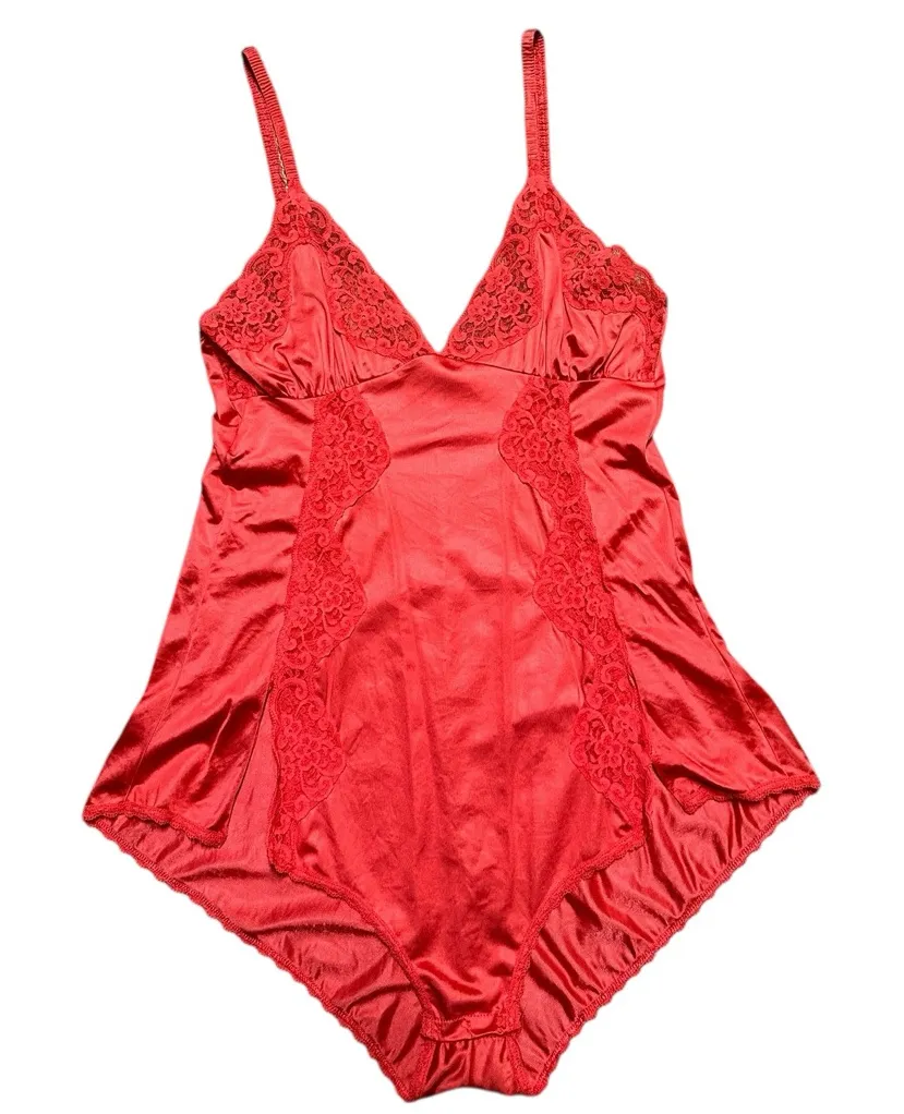 This Vintage 80s Blush Nylon Satin Lace Coral Teddy is a stunning piece of lingerie made in the USA... Show more