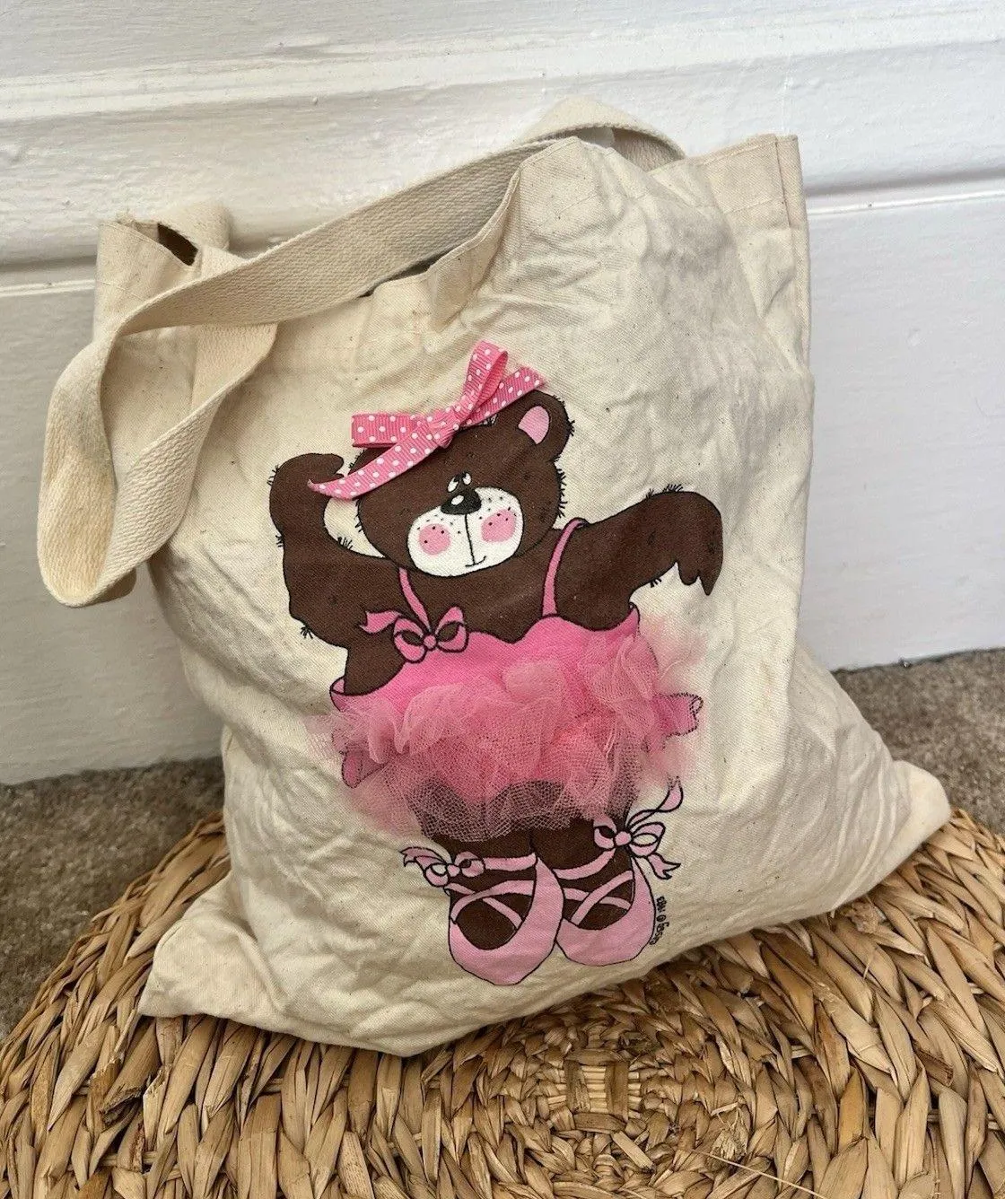 Cassy company vintage 80s teddy bear tote bag Cotton material tote Features a teddy bear in a ballerina tutu with pink white polka dot bow tie and pink tulle embellishment trim tutu Vintage tote from 1983 White color with black speckled pattern Measures 12 x 13 inches Handle drop 7 inches