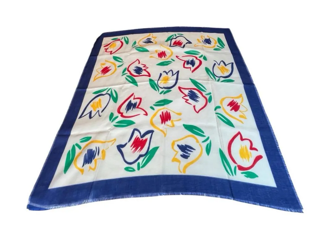 This vibrant vintage scarf is a true statement piece, featuring a bold, graphic print of tulips in primary colors of red, yellow, and blue on a cream background. Crafted from 100% acrylic and made in Japan, this large square or shawl-sized accessory l hails from the 1980s and offers a fun, retro aesthetic. The lightweight material makes it a versatile, all-season accessory. You can wear it as a shoulder wrap, a chunky neck scarf, a head scarf for full coverage, or even tie it to a handbag for a pop of color. The bright, cheerful pattern aligns perfectly with the "dopamine dressing" and "retro streetwear" trends popular in 2025 and beyond. This unique, handcrafted style accessory will add a touch of vintage elegance to any outfit. #scarfvintage #dopaminedressing #retrovibes #madeinjapan #slowfashion