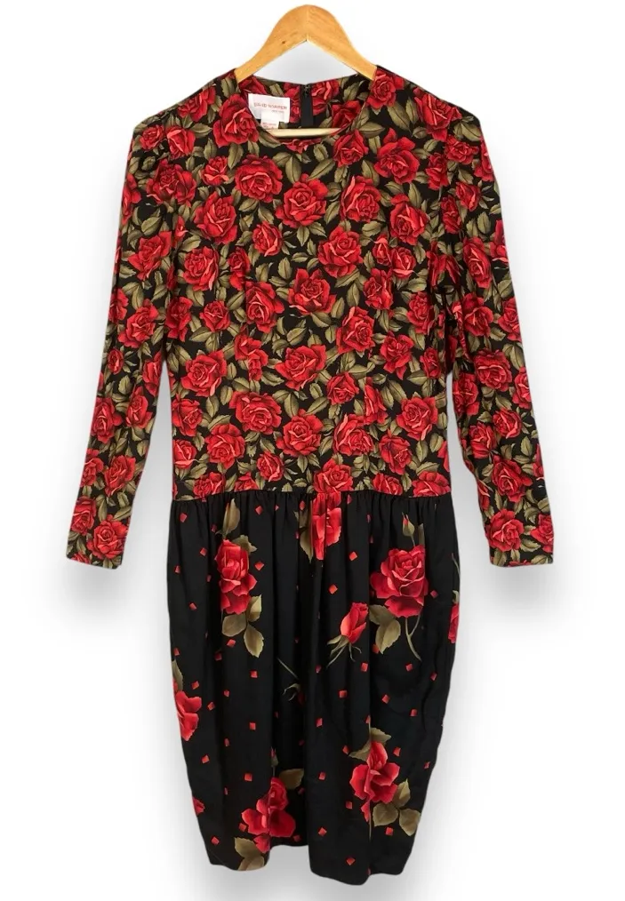 Vintage David Warren rose print dress in red, black, and green. Long sleeves, round neck, dropped waist, and hidden pockets. 100% Rayon. Made in Korea. Condition: Gently preloved, no holes or stains. Size: 8. See approximate measurements for best fit. Pit to pit: 19" Across natural waist: 15.5" Length: 42" Cleaned and from a smoke-free home. Fast shipper!
