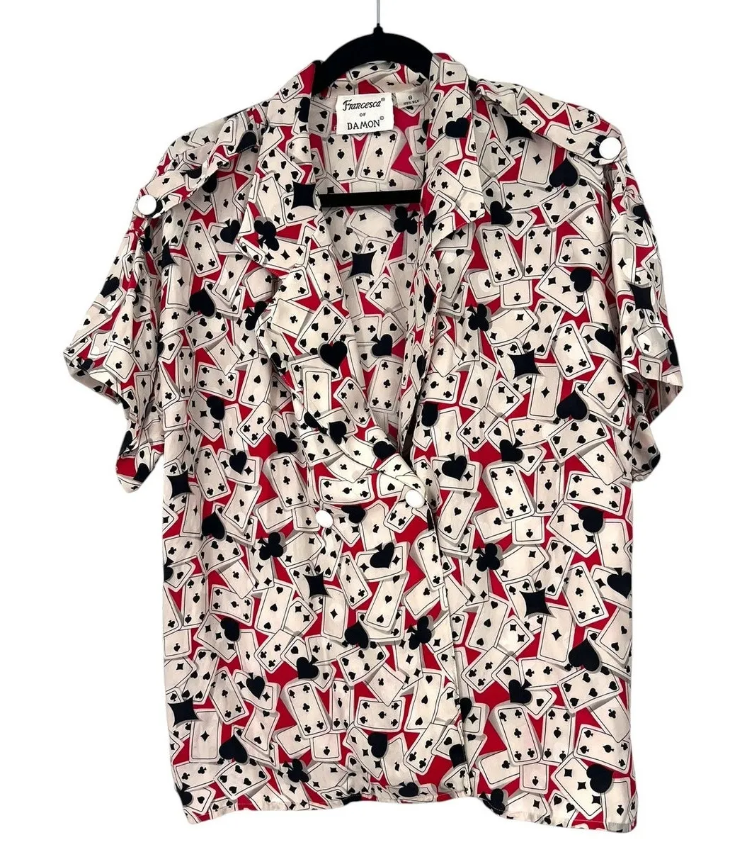 Vintage 80's francesca of damon 8 M Top Shirt Blouse Cards Poker Vegas Silk game Red Size M - $44 - From Sourced In SoCa