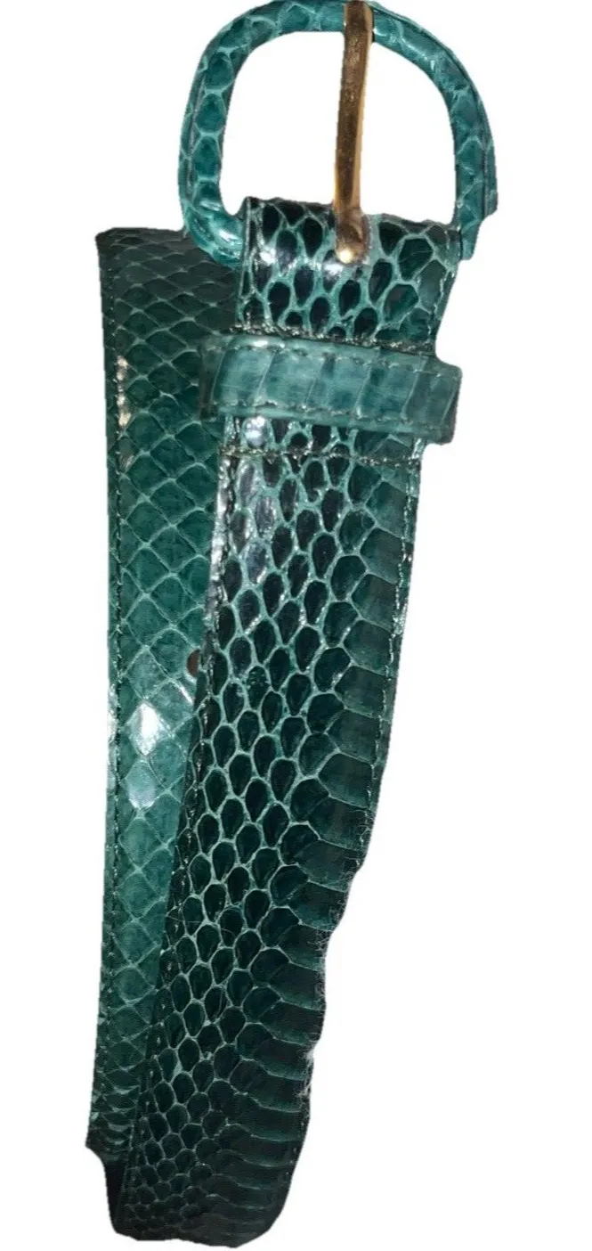 This is a vintage teal green exotic snakeskin belt in a women's size small. Belt is in excellent vintage used condition with ZERO signs of lifting or other issues. Features: * Authentic vintage 1980s exotic snakeskin belt * Genuine snakeskin (no imitation) with a rich teal green glossy finish * Matching snakeskin-wrapped buckle with gold-tone prong * Made in Taiwan R.O.C. * Perfect for vintage fashion lovers, exotic leather collectors, fans of 80s retro fashion, and as bold retro statement styling APPROXIMATE MEASUREMENTS: LENGTH (BUCKLE TO LAST HOLE) - 23" - 27" WIDTH - 1" CONDITION NOTES: THIS BELT HAS BEEN WELL CARED FOR. THE SNAKESKIN SHOWS NO LIFTING, PEELING, OR FLAKING. LIGHT AGE-APPROPRIATE WEAR TO THE BUCKLE, BUT OVERALL PRESERVED IN EXCELLENT VINTAGE USED CONDITION. WE WILL ALWAYS DO OUR BEST TO DESCRIBE EACH ITEM AND DISCLOSE ANY IMPERFECTIONS ACCURATELY. PLEASE READ EACH DESCRIPTION AND LOOK AT EACH PHOTO CAREFULLY. MEASUREMENTS ARE APPROXIMATE. FEEL FREE TO ASK QUESTIONS OR FOR ADDITIONAL PHOTOS BEFORE PURCHASING.