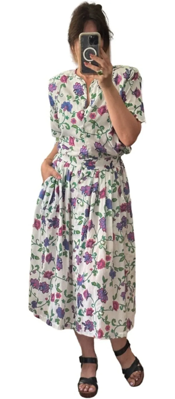 A breezy, cozy and super femme throwback to the glorious style of the mid 80’s with its billowy A frame button up skirt and scoop neck, short sleeve blouse with contouring shoulder pads to complete the look • Karen Scott • vintage 80’s • Sz M (8/10) • white with floral print • shoulder pads • elastic waist • button up • 55% cotton • 45% polyester Condition: 9/10 pre loved excellent (tiny spot on elastic waist band (back) *see photo Measurements (approximately) Top: - shoulders 17” - P2P 21” - length 26” - sleeve 10” Skirt: - waist 13” (flat front, elastic waist on back) - length 32”