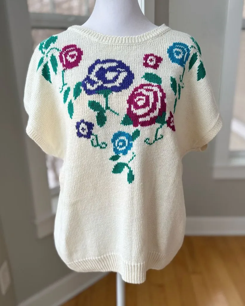 Vintage 80s Lady Devon Ivory Floral Short Dolman Sleeve Knit Top Sweater Size 1X White - $35 - From Katie