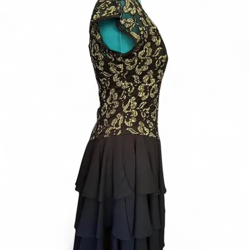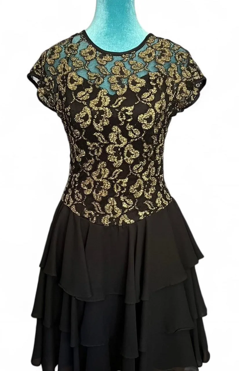 80s black and gold party dress. Lace bodice with a tiered ruffle skirt. It has flexible boning to ke... Show more