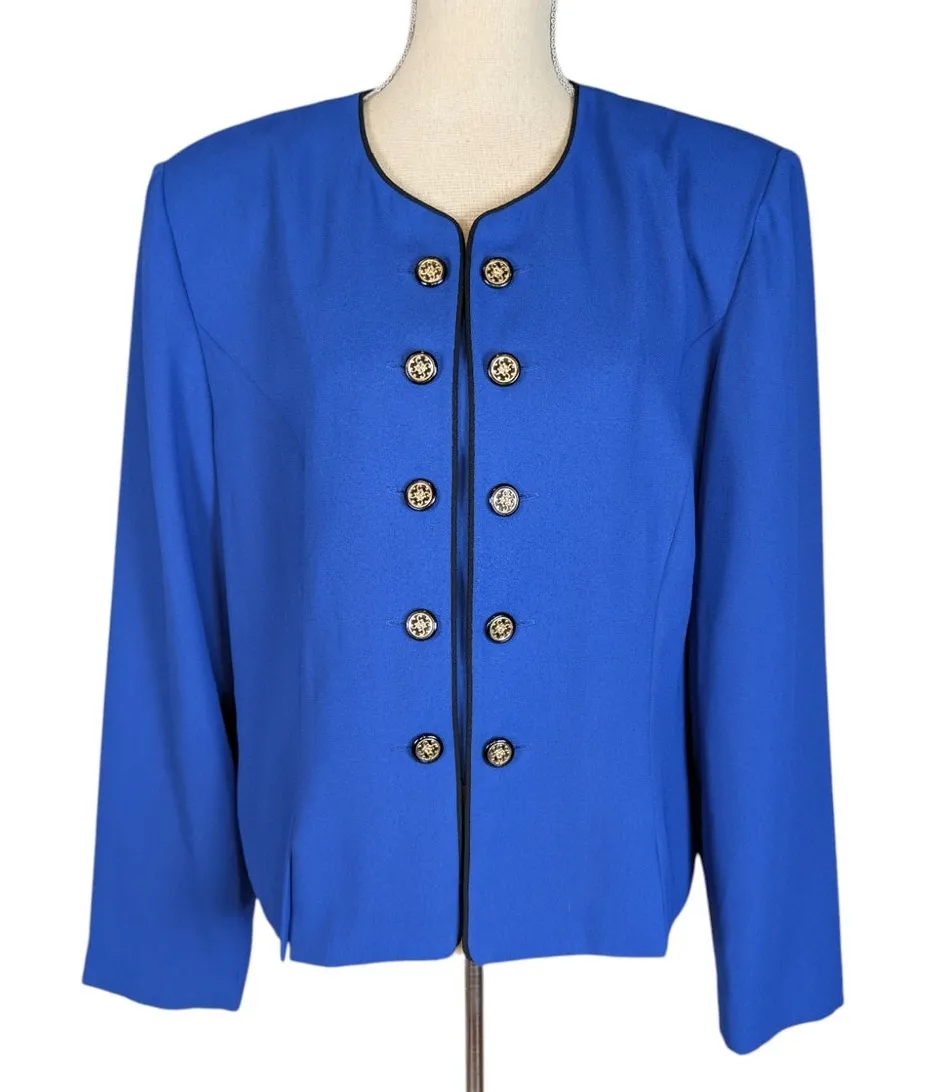 Bold vintage Leslie Fay blazer in a vibrant royal cobalt blue with sleek black piping and ornate gol... Show more