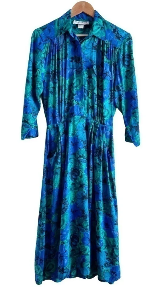 Vintage 80’s Tareti Midi Shirt Dress w/ Pockets in Blue & Green Floral Print, Size 4 Vintage 80’s S... Show more
