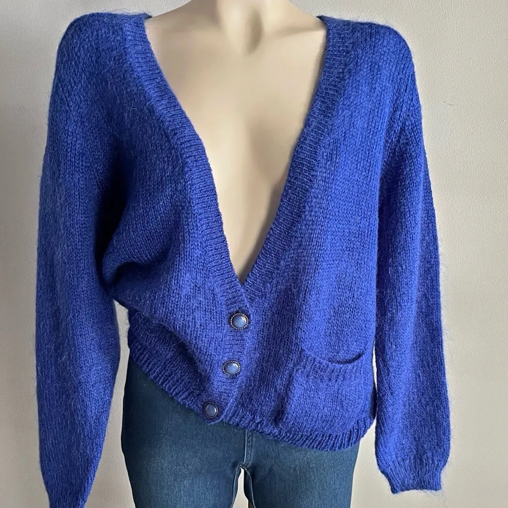 Vibrant vintage Ramble Lane cardigan in a striking royal blue mohair blend. Features a dramatic deep... Show more