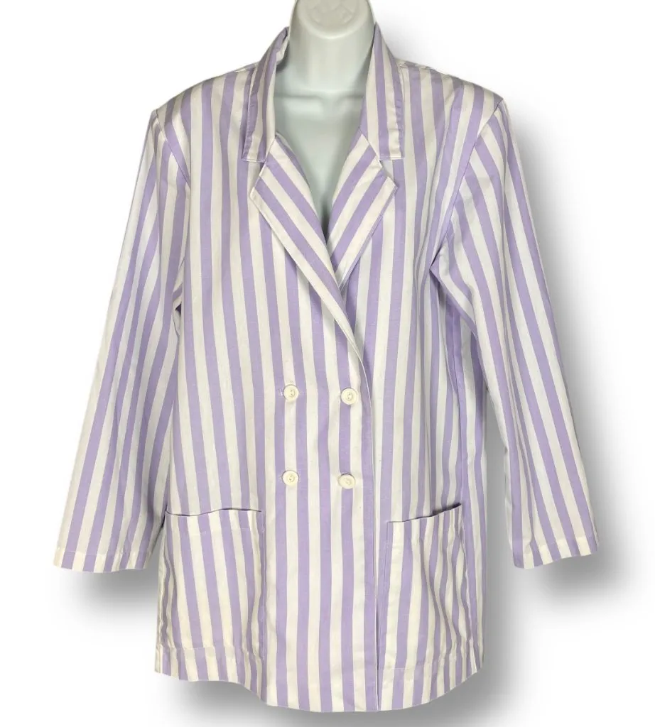 Vintage Nordstrom Brass Plum junior's boxy double-breasted blazer in purple and white stripes. Thin... Show more