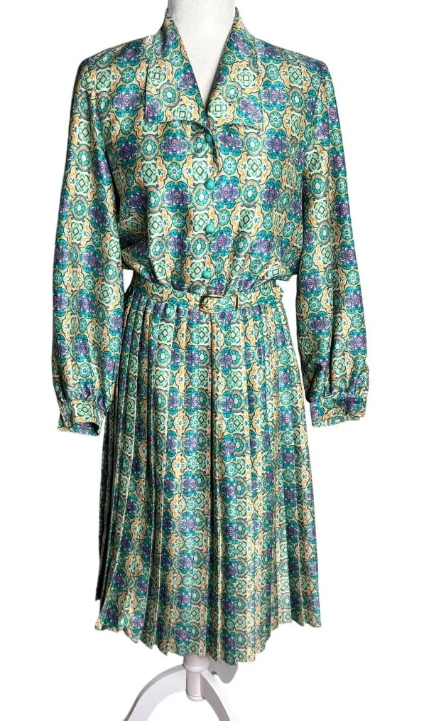 • Long sleeves with buttoned cuffs • All-over floral geometric print design • Belted waist accent • Pleated skirt with elastic waist • Lightweight, breathable material No visible flaws detected. Excellent condition Chest: 19" lying flat Sleeves: 23" Length: 43" shoulder to hem Waist: 13" unstretched, lying flat 100% Polyester Made in Canada