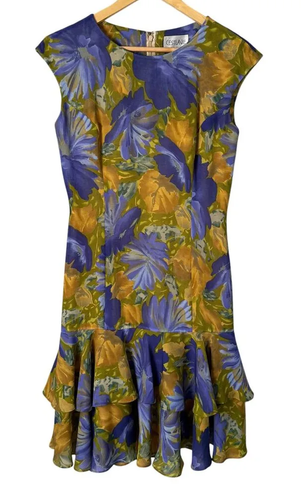 Vintage 80s Purple Orange Floral Dress Ruffle Hem Cap Sleeves, Size Small Features: round neckline, cap sleeves, darted bodice, fitted waist, knee-length ruffle hem, zipper back closure, fully lined. Color: purple, orange, and olive green floral print. 100% polyester. Made in Japan Approx. Flat Measurements: Bust (P2P): 18" Waist: 14.5" Hip: 18" Length (shoulder to hem): 39" Style: vintage, retro, 1980s fashion, cocktail, wedding guest, spring, summer, garden party, baby shower, feminine, 80s prom • Excellent preowned condition • Smoke & pet-free environment • Next-day shipping • Accepting Offers #G7S7b0502