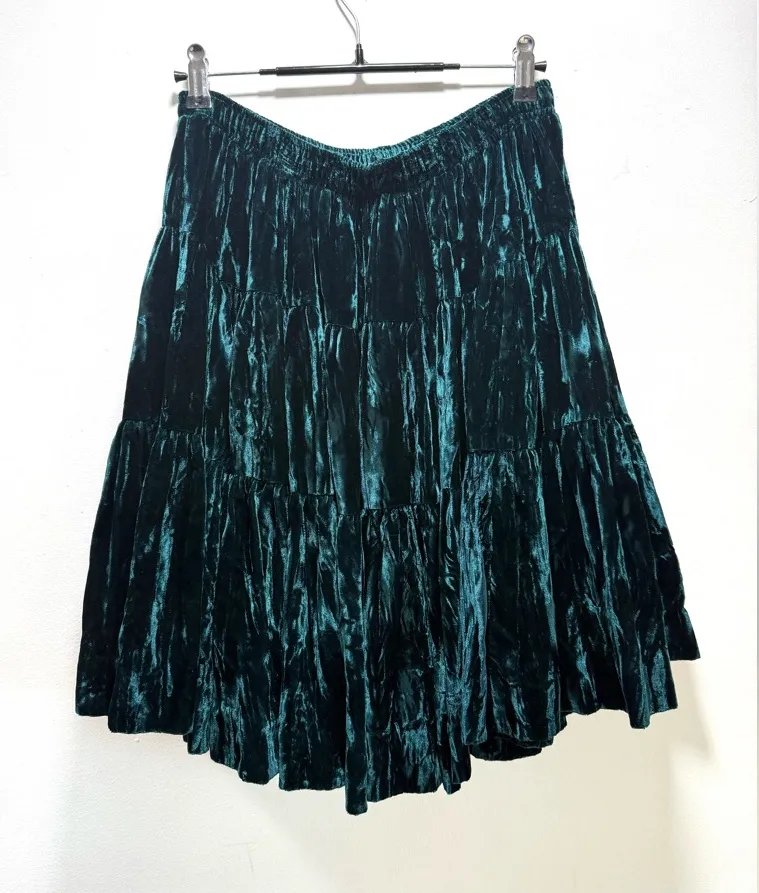 True vintage Rockmount Tru-Wear tiered skirt crafted from 100% rayon velvet. Made in the USA. Features a rich deep green velvet with beautiful drape and movement, a comfortable elastic waist with functional drawstring, and a full tiered Western / prairie silhouette. Era: Vintage, circa late 1970s–1980s (exact year unknown). Rockmount Tru-West labels were used across multiple decades; dating is based on label style and garment construction. Size: Tagged One Size Waist measures approximately 12” flat unstretched and 18” flat when comfortably stretched. Please compare measurements to a similar garment for best fit. Elastic waist is not intended to be worn fully stretched for optimal drape and longevity. Approximate length: 20–21” Excellent vintage condition with no noted flaws. Perfect for Western, prairie, Stevie Nicks–inspired, witchy, fairycore, or festival styling.