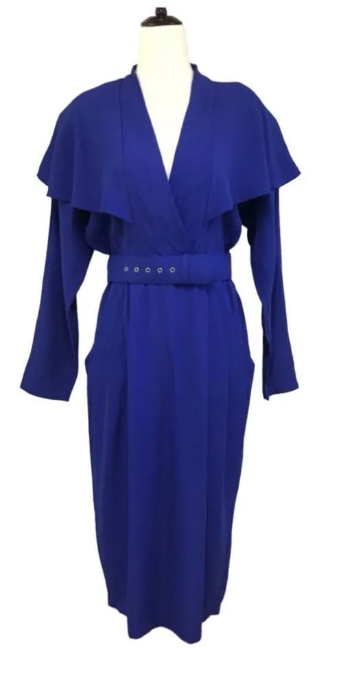 Vintage 80’s Golden Girl Style Cape Collar Faux Wrap Dress Condition: Dress is in very good vintage condition with just a few loose seams at waist; included belt is not functional as buckle is missing. Will include it in case it can be salvaged but would also look great with a classic black belt. See photos Size: 6 - vintage sizing so please see measurements in photos; waist can stretch to 15” laying flat Sheath silhouette Midi length V-neckline Large, cape collar Long sleeves Shoulder pads Elasticized waist Pockets Back slit Approximately 43.5” long Thanks for looking! Tags: Blanche Rose Dorothy Power suit dress colorful loud