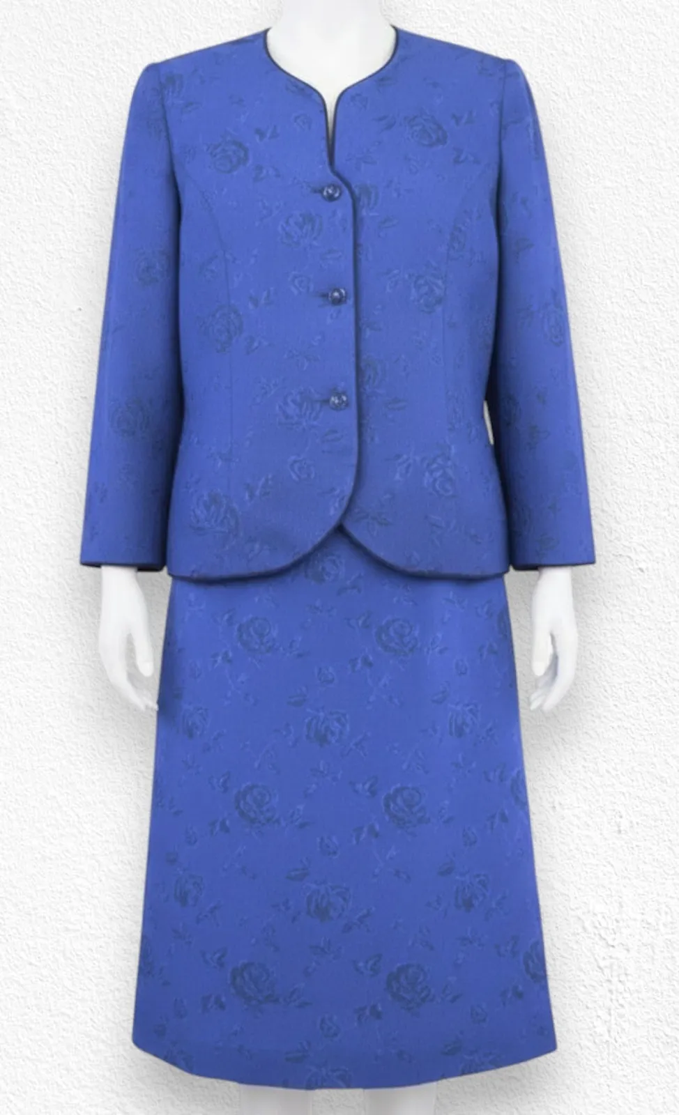 Vintage Blue Jacquard Skirt Suit Set Brand: Henry-Lee Petites Size: 12 Petite (12P) Style Name: 99-023342 Color: Royal Blue Excellent Vintage Condition (EVC) Late 1980s–early 1990s formal two-piece suit Elegant jacquard floral rose pattern throughout Rounded neckline blazer with satin piping trim Statement vintage crystal-style acrylic buttons Fully lined blazer & skirt for a smooth structured fit Straight pencil skirt with elastic at waist for comfort Made in USA of imported fabric Perfect for church, special events, vintage weddings, mother-of-the-bride, or office/career wear Timeless, modest, and beautifully tailored vintage piece Blazer Measurements (inches): Armpit to Armpit: 20.5" Top to Bottom: 22.5" Skirt Measurements (inches): Waist: 14.5" (some stretch) Length: 26" 100% Polyester Smoke-free home **All measurements are taken laying flat using a fabric measuring tape. Please note that these measurements are approximate based upon my measurements.