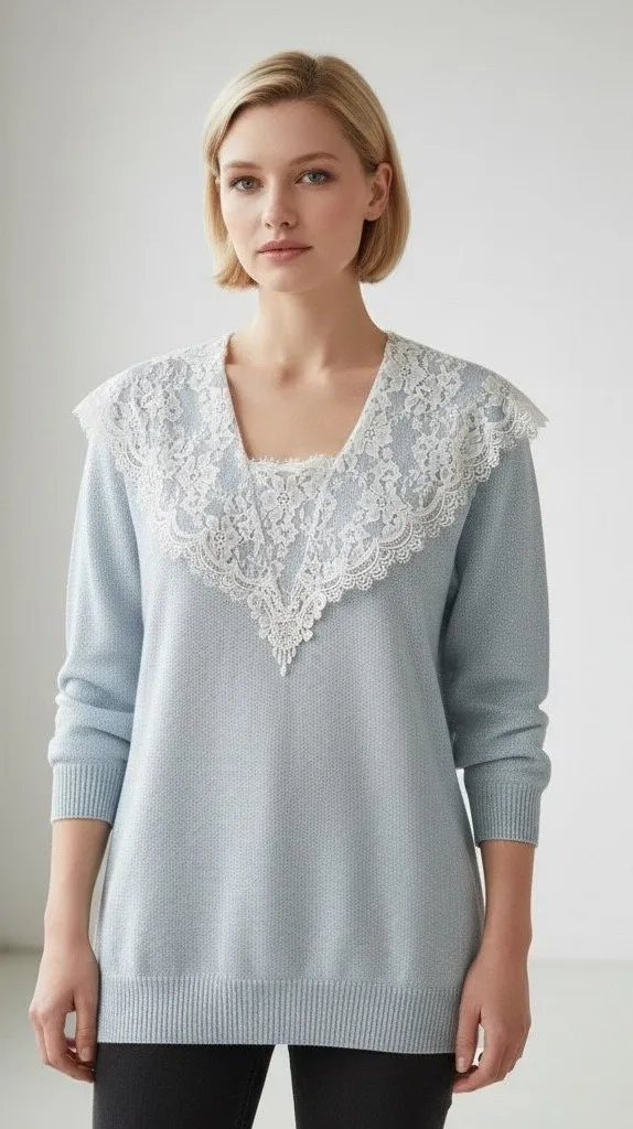 This beautiful Scott McClintock (Gunne Sax) vintage sweater brings a soft, romantic charm with its powder-blue knit and ornate white lace collar. The hand-loomed texture paired with the dramatic scalloped lace overlay gives it a unique, heirloom-inspired feel—perfect for lovers of feminine vintage style, cottagecore, and dreamy soft aesthetics. Cozy yet elegant, it’s a standout piece that layers beautifully for year-round wear. FEATURES Hand-loomed powder blue knit with ornate lace overlay Dramatic V-shaped lace collar with floral scallops Long sleeves, relaxed silhouette Vintage feminine cottagecore vibe Size: *Medium/Large* - no size tag Bust - 24" pit to pit Length - 32" shoulder to hem Measurements are taken flat and are approximate. Please compare with a similar item to ensure a good fit. Fabric Content - Rayon blend - *no fabric content tag* Care - Dry clean Excellent condition with no flaws noted Color appearance may vary depending on your monitor settings. All previously owned items have been cleaned and sanitized. coquette, soft girl aesthetic, romantic vintage, shabby chic, heirloom style, lace detailing, pastel aesthetic, feminine vintage, prairie style, Victorian-inspired, retro knitwear, elegant lace collar, soft classic, timeless feminine