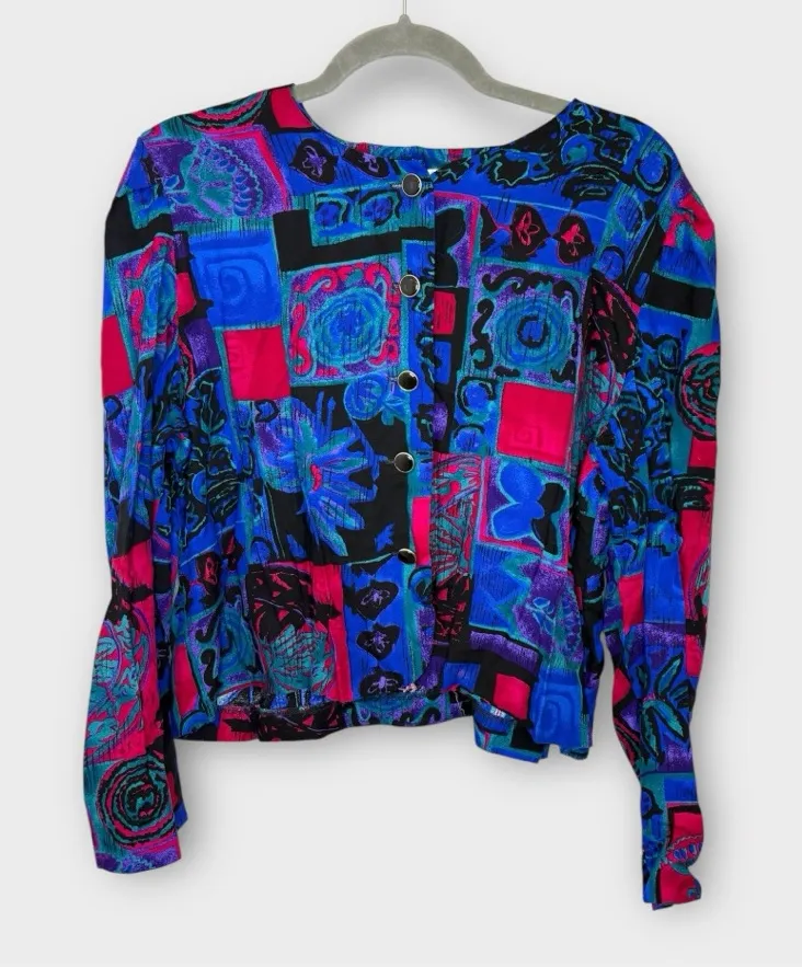 Step back into the late ‘80s/early ‘90s with this vibrant Special Effects blouse, featuring an abstract patchwork print in bold jewel tones of electric blue, fuchsia, teal, and purple. Made in the USA from soft 100% rayon, this top has a boxy, slightly cropped fit and eye-catching gold-tone statement buttons down the back. • Brand: Special Effects (vintage) • Size on tag: 18 (Misses) – see measurements for best fit • Measurements: • Pit to pit: 21.5” • Length: 19” • Material: 100% rayon • Color/Pattern: Multicolor abstract patchwork with geometric and floral motifs • Condition: Pre-owned, excellent vintage condition with no notable flaws. Perfect for lovers of bold retro style, statement prints, and unique vintage finds. Great for pairing with high-waisted trousers, skirts, or jeans for a true throwback look. Ships from a smoke-free, pet-friendly home.