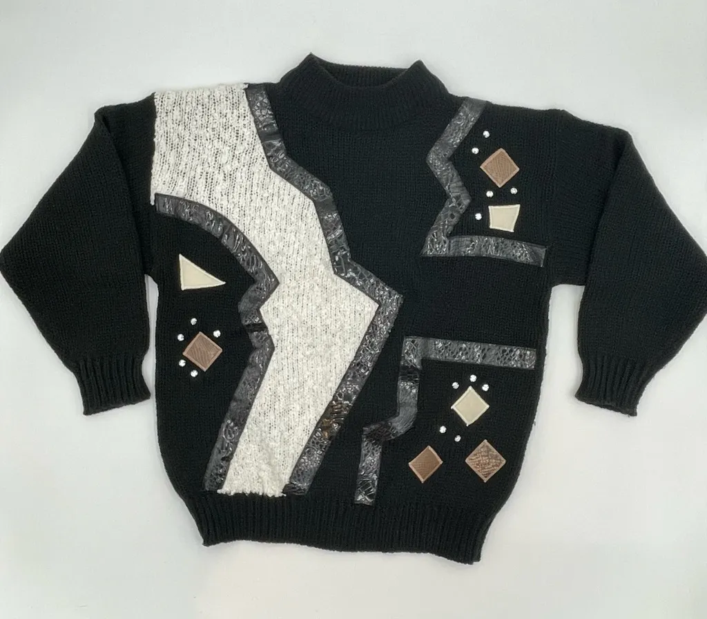 Vintage 1980s funky sweater with abstract design on the front with plastic jewels and faux snakeskin. Mock neck, long sleeves. Brand: A Little Extra Spice Condition: preloved with snags and general wash wear and fuzziness. Size: Vintage tag reads 20W. Estimating to fit as and listing as a modern size large. See approximate measurements for best fit. Pit to pit: 21" Length: 24.5" Cleaned and from a smoke-free home. Fast shipper!