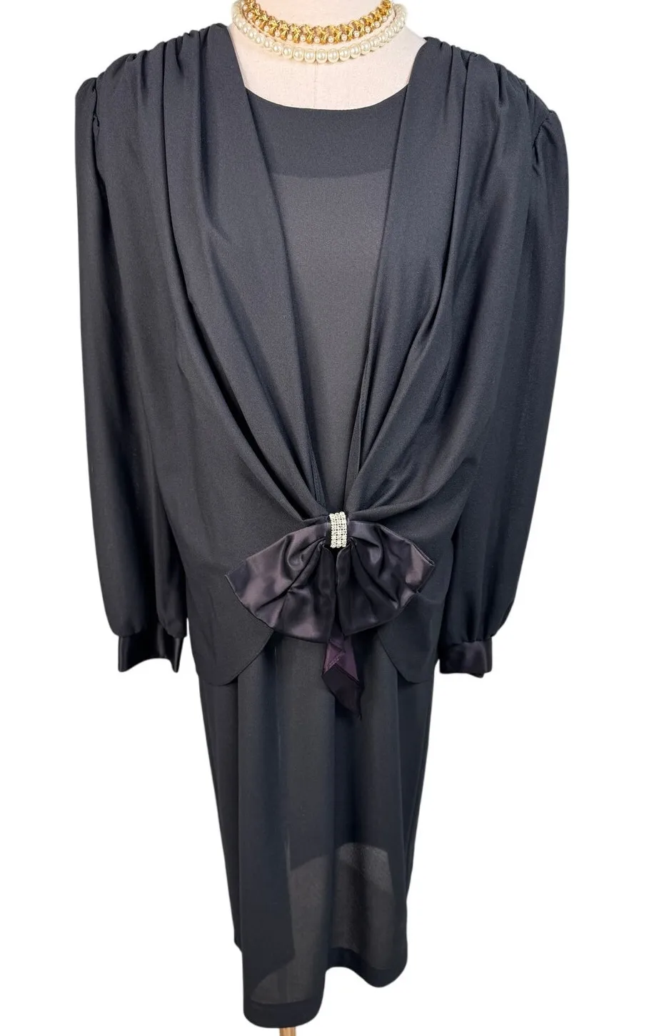 RAD vintage 80s TF/T&F draped front drop waist rhinestone bow party dress! Lightly patted shoulders. Satin cuff with rhinestone buttons. Sheer! You were meant to wear this with your slip. Just the most fun you can have in dress! Made in the USA back in its day Measures flat approximately Shoulder 17" Sleeve 22.5 Chest 21.5 “Waist” 20 Hip 21 •Size: fits modern size 10/medium •Condition: Excellent vintage – little bit of fading on the tail of the satin bow •Color: black and silver rhinestone Bundle for combined shipping! Pictures are part of the description. Color may vary by screen. Smoke free, DOG FRIENDLY home. tags: vintage 80s retro flapper 1920s inspired great gatsby beaded glam cocktail holiday party new years eve festive celebration night out speakeasy theme roaring twenties vintage glamour retro chic statement style soirée event dressing party wear winter wedding guest jazz age vibe costume theater