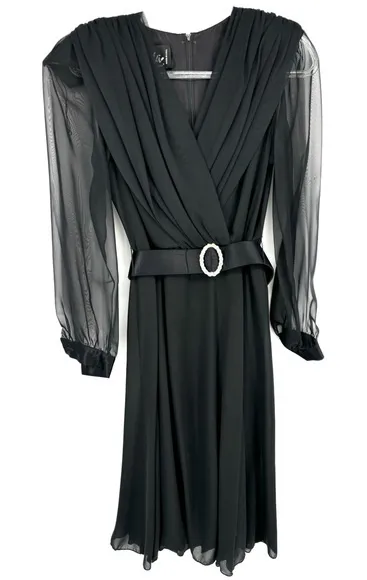Vintage Ursula Of Switzerland Black Midi Dress Size 8 Color - black Gorgeous vintage black midi dress circa the 80s Sewn in shoulder pads that could be removed Surplice neckline Pleated shoulders and waist Hidden rear zipper Semi sheer sleeves with a satin cuff Rhinestone diamond button at the wrist Original belt with rhinestone diamond center Condition Very good, no flaws noted, see photos Measurements are approx Chest 17" Length 46" Elastic Waist 13"-15" All items ship from a pet and smoke free environment Fabric - see photos Fast shipping 90s , 1980s , wedding guest , mother of the bride dress Formal , unique , event wear , cruise wear , fun , flashy Dressy , pretty , glamorous Bin - 117