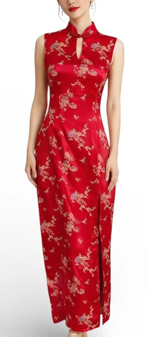 Vintage All That Jazz cheongsam maxi dress Red satin brocade fabric with floral bird motif Mandarin... Show more