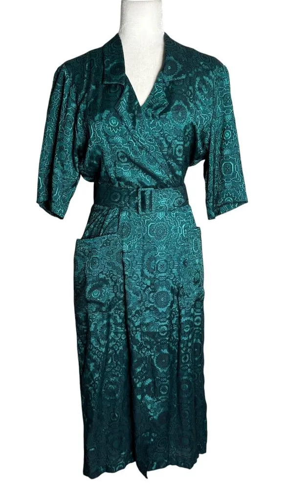 • Wrap-style dress with belted waist • Features two side pockets • Lightweight satin fabric with teal & black floral pattern • Short sleeves with relaxed fit • Mid-length hemline Excellent condition Made in USA, no fabric tags Chest: 18" lying flat Sleeves: 13" Waist: 12" lying flat, unstretched Length: 47" shoulder to hem