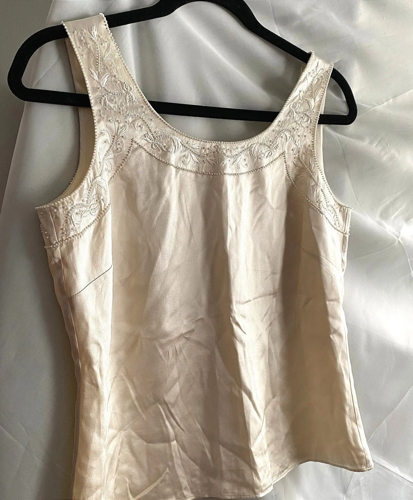 Vintage 1990's / Y2K delicate cream fitted, lined, beaded satin cami. Features intricate floral detailing along the neckline and straps for a touch of sophistication. In excellent condition, no flaws. Measurements: • Bust: 18 in • Length: 21 in Type: Tank Department: Women Style: Camisole Material: Faux silk Neckline: Scoop Neck Sleeve Length: Sleeveless Sleeve Type: Classic/Fitted Sleeve Pattern: Solid Accents: Embroidered, Beaded Features: Stretch Fit: Classic Fabric Type: Satin Occasion: Party/Cocktail, Formal Closure: Pullover Season: Spring, Summer, Fall bohemian, eveningwear, 1990s, 90's, femme, silk camisole, lace trim, cream top, women's tank, elegant, sophisticated, layering piece, bridal, romantic, brunch outfit, loungewear, feminine, delicate, evening wear