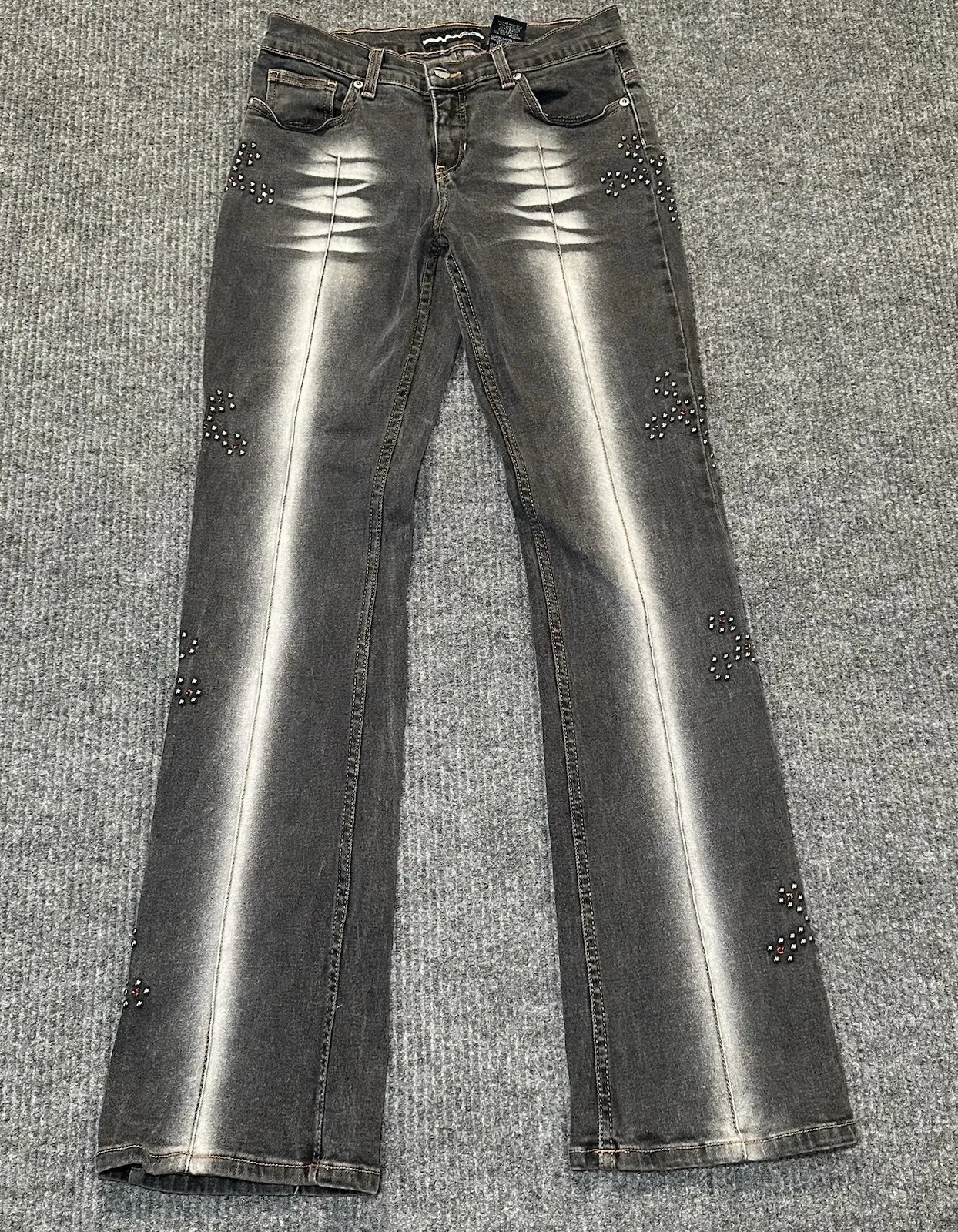 The product is a pair of vintage 90s Bebe denim jeans with beaded crosses, size 30, made in the USA.... Show more