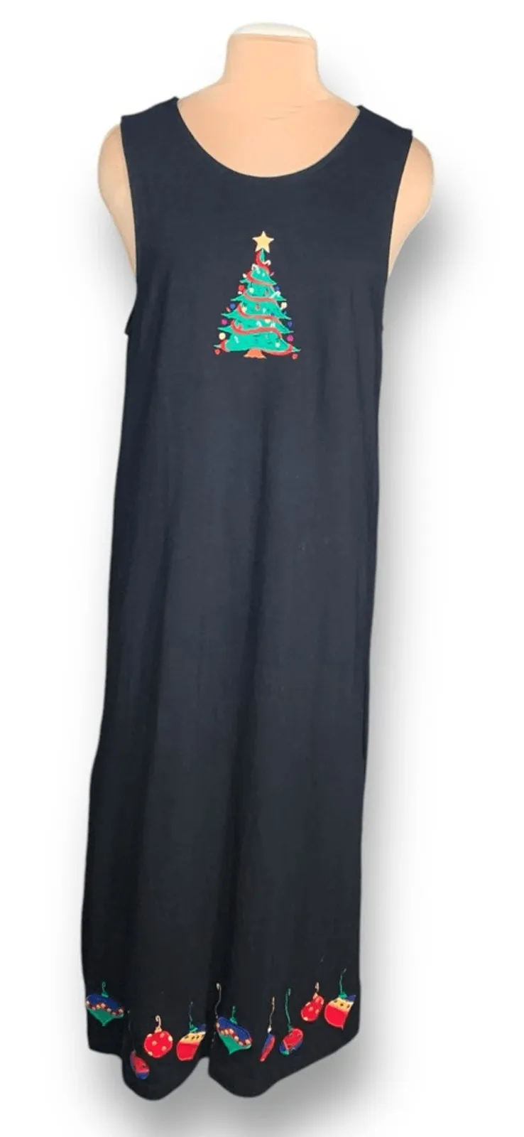 Westbound vintage sleeveless black jumper style dress Embroidered Christmas tree at chest Embroidered ornament trim at hem Scoop neckline wide shoulder straps Pullover easy relaxed fit Maxi length holiday statement piece Made in Hong Kong 100 percent cotton exclusive of decoration Size Large Flat Lay Measurements 21 inches pit to pit 22 inch waist 49.5 inch length Perfect for holiday parties Christmas events winter gatherings